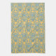 This kitchen towel has a damask element / motif, created by Kristie Hubler, repeated, in a robins egg blue / ocean blue / aqua blue colour, with a light yellow pumpkin / Italian / Mediterranean gold coloured background.  Old worldly, again, Mediterranean looking.