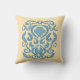 Damask robins egg blue old world creamy pillow, designed by Kristie Hubler, has an old world style damask design, repeated pattern on front, single on back, with an aqua, teal blue graphic damask motif, and creamy yellow peach gold background.