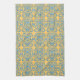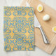 Cette serviette de cuisine a un élément damassé / motif, créé par Kristie Hubler, répété, dans un bleu d'oeuf rouge / bleu océan / bleu aqua, avec un citrouille jaune clair / italien / arrière - plan de couleur or méditerranéenne. Vieux monde.
