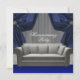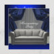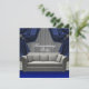 Grey damask sofa and royal blue drapes blue and grey sofa housewarming party invitation.