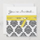 This design features a large Damask pattern in black with a canary yellow faux ribbon on a linen background for the fashionable bride. This save the date card is available in several different paper finishes and sizes. If you are looking for a matte finish, then take a look at the speckled, recycled or felt finishes. If you prefer a glossy finish then choose the basic, linen or metallic finishes. You can customize all text by clicking on the ‘customize’ option. There are matching items available. Such as damask wedding invitations, damask be my bridesmaid cards and mugs, RSVP and thank you cards and many more. Menu cards, table numbers etc available upon request. Design by firedropdesign.com copyright 2010