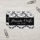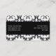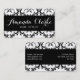 Conception de carte de visite élégante de coiffeur de motif de damassé par le © d'Elke Clarke. Plus de couleurs et de styles disponibles chez www.zazzle.com/damaskgallery. Une belle, souple conception de damassé noire et blanche avec une ligne noire arrière - plan. Votre nom et profession sont sur l'avant de la carte dans une police à la mode de manuscrit et votre information d'affaires est sur le dos. Personnalisable avec votre couleur de l'information et d'arrière - plan.