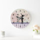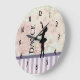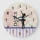 A cute clock with a silhouette of a ballerina on a pretty background. This elegant ballet dancer is standing on her toes, en pointe with her arms outstretched gracefully. The word "DANCE" written beside this elegant dancer. The background is composed of a shabby vintage looking pattern with flower blossoms. The bottom portion of the design has vintage style lavender stripes alternating in dark and light colours.