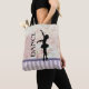 A cute bag with a silhouette of a ballerina on a pretty background. This elegant ballet dancer is standing on her toes, en pointe with her arms outstretched gracefully. The word "DANCE" written beside this elegant dancer. The background is composed of a shabby vintage looking pattern with flower blossoms. The bottom portion of the design has vintage style lavender stripes alternating in dark and light colours.
