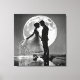Celebrate love, passion, and timeless romance with this enchanting black-and-white illustration. It depicts a silhouetted couple sharing a magical dance beneath a full moon, bathed in the gentle glow of falling rain. This artwork exudes elegance and charm.