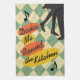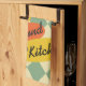 Fun retro kitchen towel with the words Dance Me 'Round the Kitchen. A midcentury style illustration in orange, yellow, and green shows a vintage kitchen linoleum tile background with part of a silhouette of a couple dancing, musical notes, and retro font. What's more fun than dancing in the kitchen?