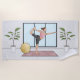 The woman is placed in a modern room with three large windows and large green leafy plants. The woman is standing on a pinkish colour yoga mat. There is a round yellow colour exercise ball next to the woman as well.