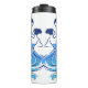 Waltz your way into hydration. Dance couple in blues and greens adorn the travel mug.