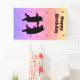 This banner or backdrop is yellow, Salmon, pink and purple with two happy dancing black bears in silhouette form wearing striped pink and purple party hats with two strings of stars on the sides. Customise your text with the template.
