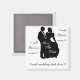 A black silhouette of a bride and groom dancing. Text reads: "Save The Date". Includes customizable text for adding the Bride and Groom's names and wedding date. This design works best on a square magnet. Order in bulk and save!