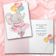 Here's a cute birthday card for any child! The front features a grey elephant dressed up in a pink tutu and ballet slippers. She holds a string with three brightly coloured balloons. The inside of the card has text fields in grey and teal for you to customize or leave as is. It also has a second image of the balloons.