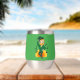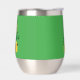 Wine Tumbler with an Illustration of a smiling happily dancing leprechaun wearing a green suit, a bow-tie, and a bowler hat; with black notes and a yellow and orange rainbow in green background.