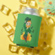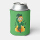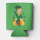 Can Cooler with an Illustration of a smiling happily dancing leprechaun wearing a green suit, a bow-tie, and a bowler hat; with black notes and a yellow and orange rainbow in green background.