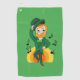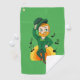 Golf Towel with an Illustration of a smiling happily dancing leprechaun wearing a green suit, a bow-tie, and a bowler hat; with black notes and a yellow and orange rainbow in green background.