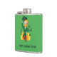 Flask with an Illustration of a smiling happily dancing leprechaun wearing a green suit, a bow-tie, and a bowler hat; with black notes and a yellow and orange rainbow in green background.