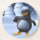 3D digital render of a cute dancing penguin wearing a sailor hat on a winter landscape background