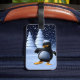 3D digital render of a cute dancing penguin wearing a sailor hat on a winter landscape background