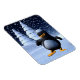 3D digital render of a cute dancing penguin wearing a sailor hat on a winter landscape background