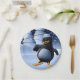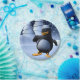 3D digital render of a cute dancing penguin wearing a sailor hat on a winter landscape background