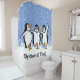 Dancing Penguins Design Shower Curtain with customizable background colour and text.