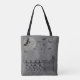 Creepy Halloween night with four skeletons dancing towards an ornate rod iron gate. A quiet black cat sits, watching down on them. In the sky is a witch flying on her broom in front of the moon, along with lots of bats. This makes a great trick or treat bag for the kids or a fun Halloween tote bag for women to use about town!