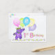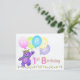 A purple teddy bear princess dressed up in a lovely yellow jewelled crown and pink, blue and green flowers is dancing through the flowers and holding a bunch of colourful balloons with the word HAPPY on them. This happy birthday postcard will bring a smile to a special girl on her 1st birthday. Personalize with her name to make it extra special. Original design by Anura Design Studio.