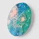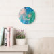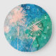 Abstract watercolor art original art of dandelion flower blowing in the breeze on an abstract blue and green cool coloured background.