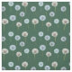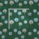 This fabric or material features an all over pattern of photos of dandelions or dandelion clocks in white and lime green set against a dark green background.