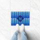 Doormat in a Mid-Century Modern Danish inspired textile pattern of stylized leaves - shades of blue, from light sky blue to deep cobalt, accented with white, on a dark navy / indigo blue background ,with monogram