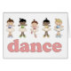 Cinq adorables ballerines dansent sur ce design, revêtues de costume et de chaussures. Mot rose "danse" en dessous d'eux.