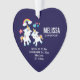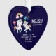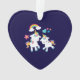 Un ornement en forme de coeur avec 2 mignonnes licornes dansantes avec queues vives et colorées, et crinière. Un arc-en-ciel coloré avec des nuages de chaque côté au-dessus de la tête. D'autres éléments comprennent une petite fleur au coeur et quelques étoiles. Arrière - plan violet foncé. Personnalisez avec des informations sur la naissance du bébé.