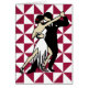 Carte de voeux de style vierge montrant des danseurs de tango passionnés contre un arrière - plan géométrique bordeaux.