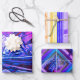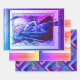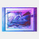 Une oeuvre d'art présente une femme semi-abstraite avec un châle / voile dans les tons bleu, jaune, violet et rose.