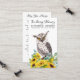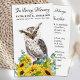 Cardinal d'aquarelle et tournesols avec des cartes de prières funéraires sympathy eucalyptus. Cette carte de prière commémorative moderne mais élégante présente un hibou blanc dans un bouquet de tournesols et d'eucalyptus. Avant "In Loving Memory" Personnalisez cette carte de prière funéraire commémorative avec vos proches nom et date, et sentiment. Retour ~ Poème 'Puissiez-vous toujours marcher dans Sunshine', qui peut être personnalisé, s'il vous plaît tendre la main si vous voulez un design avec un poème spécifique autre que. Cette carte de prière commémorative sera un souvenir précieux, pour les services funéraires et la célébration de la vie. DROIT D'AUTEUR © 2020 Judy Burrows, Black Dog Art - Tous droits réservés. Carte de prière funéraire commémorative Chouette Oiseau Fleurs de soleil