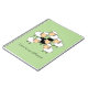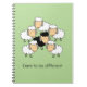 Funny black sheep notebook. A group of white sheep with pink faces and grey ears are surrounding a woolly black sheep, also with a pink face and grey ears. Below is a caption "dare to be different" in black lettering.