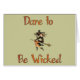 A lovely little witch in striped stockings tips her hat while riding on her broom, and dares you to be wicked!