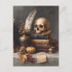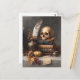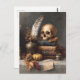 A moody and atmospheric still life painting featuring a human skull resting atop a stack of antique books. Surrounded by dried leaves, a black candle, aged parchment, a striped feather, and a small gourd, this gothic composition captures the essence of dark academia and autumnal mystique. Perfect for lovers of vintage decor, scholarly aesthetics, and macabre beauty.