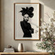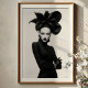 Make a striking statement with this captivating black and white art print, a true masterpiece of avant-garde fashion and artistic expression. This compelling frontal portrait features a woman of intense allure, crowned with an extraordinary, sculptural black hat that unfolds like a dramatic, dark blossom. Dressed in a sleek black turtleneck, complete with elegant leather gloves and shimmering silver bracelets on one wrist, her attire is a study in sophisticated minimalism. Her pale skin, stark black lips, and dramatically winged eyes create a mesmerizing contrast against her dark ensemble and the pristine white background, emphasizing her powerful and direct gaze. With arms confidently crossed, this artwork embodies a fierce, mysterious, and undeniably chic elegance. Perfect for modern living spaces, fashion studios, or any decor seeking a touch of unique sophistication, bold artistry, and a truly unforgettable visual narrative.