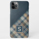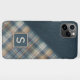 Contemporary tan, brown, beige, taupe, and dark teal blue tartan plaid, and a faux leather texture pattern background. With room to customize or personalize with a name monogram or initial of your choice. Beautiful, modern, and cool cover for the trend-savvy and art-loving hip trendsetter, artsy motif lover who wants to protect their phone from dust and dirt, wear and tear. This design is available for Apple iPhone 6, 7, and 8 Plus, 10 or X, XR, XS, 11, 12, 13 Mini, 14, 15 Plus, and Pro Max cellphone cases. Show off your style, look fashionable, and feel stylish with a unique design on a mobile device accessory of your choice.