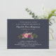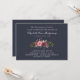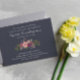 A floral memorial invitation in dark blue with a small bouquet of pink roses, burgundy hydrangeas, and other flowers.