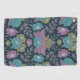 This golf towel features flowers in shades of purple, blue, and olive green surrounded by muted purple fern fronds and leaves on a dark blue background.