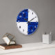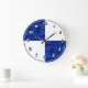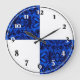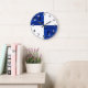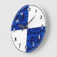 This beautiful clock is decorated by quarters, alternating black numbers on a white background and white numbers on an elegant dark blue satin pattern.