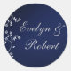 Dark blue background with silver leaves and bride and groom's name in soft grey script. Great for gift bags, envelope seals, shower decorations and more.