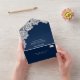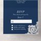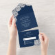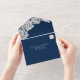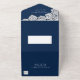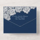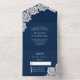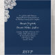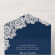 Chic dark blue coloured tri-fold wedding invitation, with lovely graphics of white lace. The custom text is ready to personalize for your wedding day.