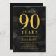 Classy 90th Birthday Party invitation featuring the words "Cheers to 90 Years" in faux gold foil against a dark grey bokeh pattern background. Invitation has a dark grey background back side.