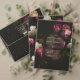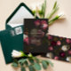 The classic serif typography pairs beautifully with the dramatic florals, creating a timeless yet modern statement piece for your celebration.