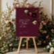 Create a dramatic first impression with this moody dark floral wedding welcome sign, featuring rich burgundy, deep plum and soft ivory blooms set against a striking black background.