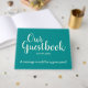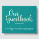 This minimalist guestbook features the messages "Our Guestbook" and "A message would be appreciated!", along with a personalized event date. The text is coloured ivory, and the background is coloured dark cyan. A generic, customizable guestbook such as this could perhaps be used at an event such as a birthday party, a retirement party, a family reunion, a funeral, or some other event with guests who may want to leave a message.