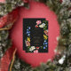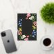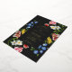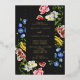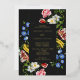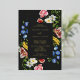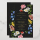 A moody wedding invitation featuring gold foil text and a rectangular frame overlaying large watercolor flowers in blue, yellow, white, red and pink on a charcoal background.