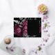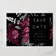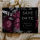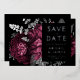 This elegant, moody wedding Save the Date card features a lush, romantic floral bouquet in burgundy red with silver faux foil and glitter foliage on a black background. Customize the real silver foil text in stylish fonts on a black rectangle, and add your wedding website URL to the solid black back.
